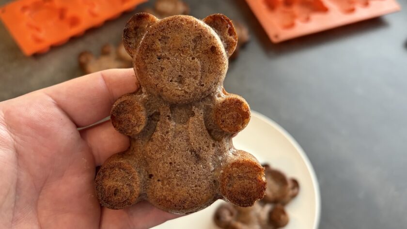 - Těsto pak rozdělíme rovnoměrně do formy na medvídky vhodné pro horkovzdušnou fritézu (nejraději saháme po silikonové)